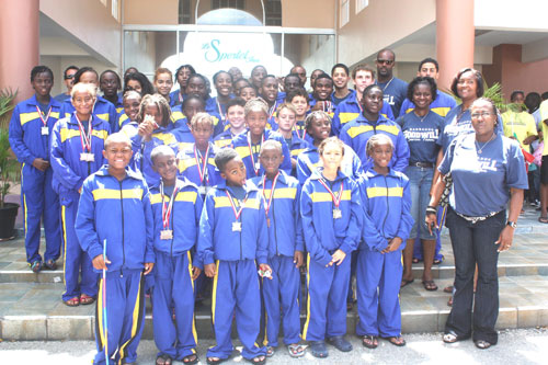 Front row: l-r:Niel Skinner, Taj Gulstone, Nokosi Dunwoody, Kai Trotman, Amethyst McKenzie, Ashley Weekes, Kendi Bynoe, Michelle Willoughby, Destiny Harding, Danielle Titus, Britney McCollin.Second row:l-r:Nicholas Hall, Damon St Prix, Joshua Coles, Vanessa Keany, Kent Mullins, Tiffany Titus, Jonathan Manning, Jack Kirby, Andreina Mason, Luis Sebastian Weekes, Kobi Talma.Third row l-r:Rishonna Phillips, Akeem Nurse, Kyle Inniss, Jordan Forde, Leaundre Knight, Aautumn Wharton, Jade Searles, Shannan Smith,Chenise King. Back row l-r:Russell Walton-Assistant Coach, Judith King-Chaperone, Enrico Mcconney-Assistant Coach, Antonio Martinez Petrolanda-Head Coach, Pamela Mullins-Manager. Missing from photograph are:Swimmers:–Kai Proverbs, Jelani Forde, Gabriel Gunby, Tristan Ward, Melanie Singh-Team Officials- Rolando Consuegra Garcia-Assistant Coach Cyrilene Willoughby & Jennifer St Prix-Chaperones.